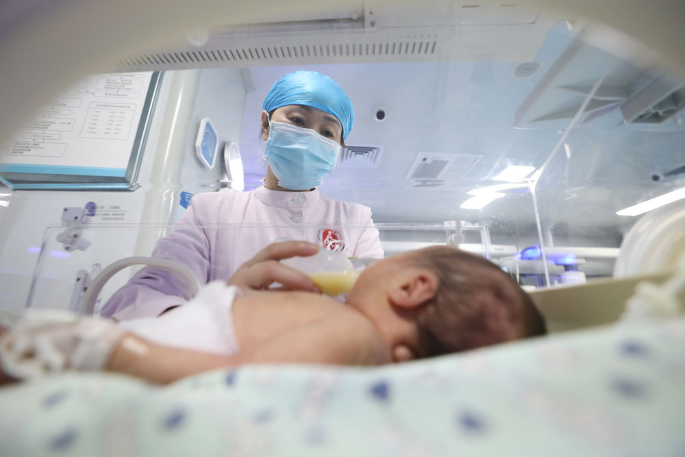 2026年1月1日,在河南省焦作市溫縣婦幼保健院新生兒科,護士為新生兒喂奶。新華社發(fā)(徐宏星攝)
