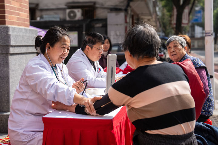2026年3月5日,在湖南長沙市望城區(qū)高塘嶺街道雷鋒路社區(qū)雷鋒驛站,志愿者(左一)為市民測量血壓。新華社記者 陳思汗 攝