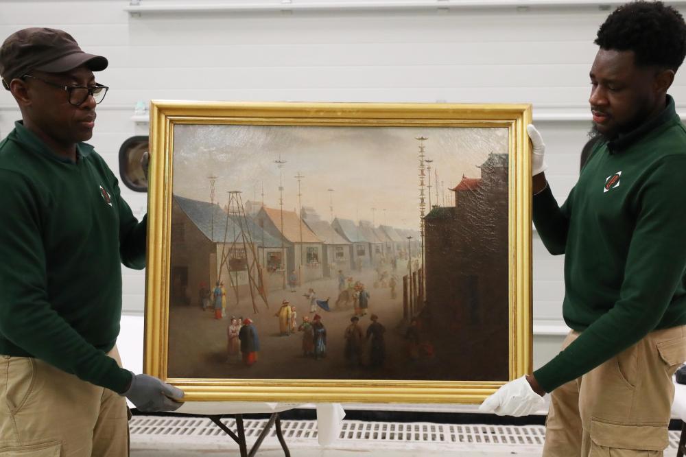 3月11日,在法國巴黎近郊的凡爾賽宮,工作人員準備打包油畫《南京的集市》。在2024年中法建交60周年暨中法文化旅游年之際,凡爾賽宮和故宮博物院將于4月至6月在故宮共同舉辦“凡爾賽宮與紫禁城”展覽。新華社記者高靜攝