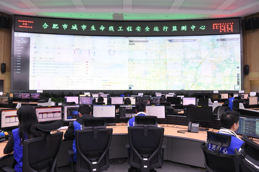 技術(shù)人員在位于清華大學(xué)合肥公共安全研究院的合肥市城市生命線工程安全運行監(jiān)測中心值守(2024年4月8日攝)。合肥市2015年啟動城市生命線安全工程建設(shè),逐步構(gòu)建燃?xì)?、橋梁、供水、排水、熱力、綜合管廊、消防、水環(huán)境八大領(lǐng)域立體化監(jiān)測網(wǎng),探索出一條以場景應(yīng)用為依托、以智慧防控為導(dǎo)向、以創(chuàng)新驅(qū)動為內(nèi)核、以市場運作為抓手的城市安全發(fā)展新模式。