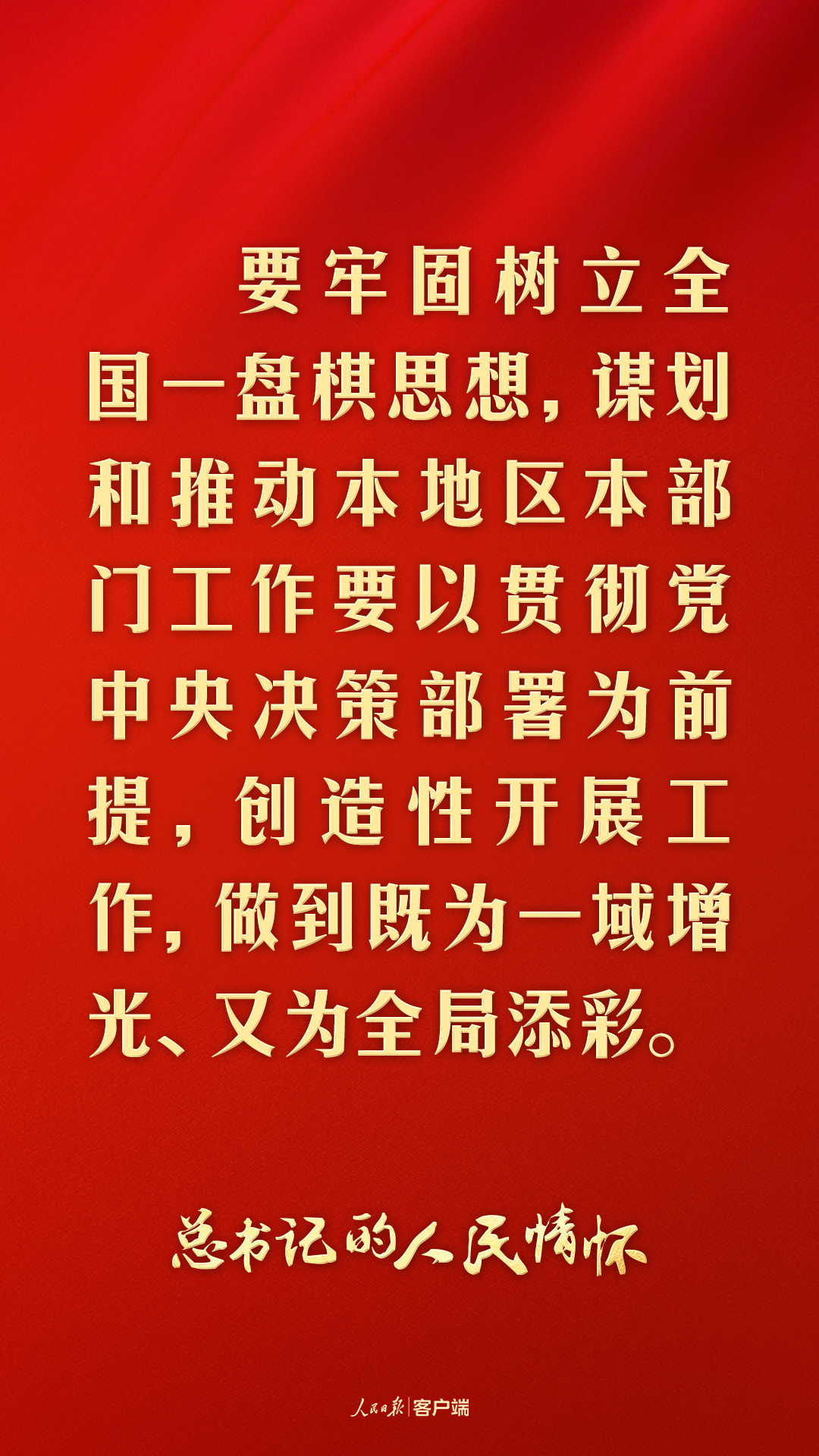 “要牢固樹立全國(guó)一盤棋思想,謀劃和推動(dòng)本地區(qū)本部門工作要以貫徹黨中央決策部署為前提,創(chuàng)造性開展工作,做到既為一域增光、又為全局添彩。”