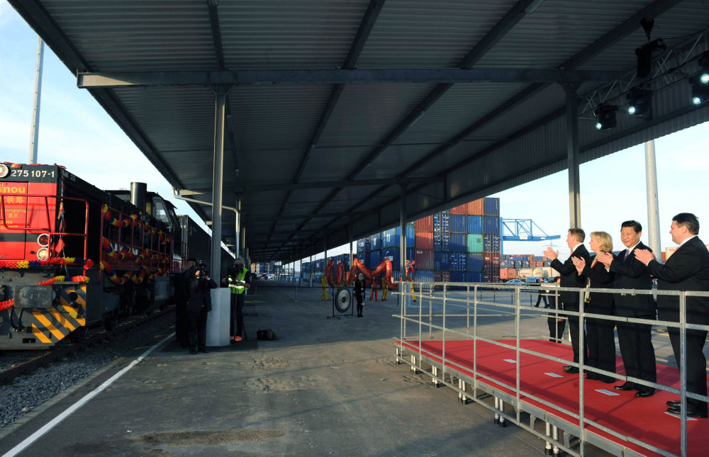 2014年3月29日,德國杜伊斯堡港?!坝逍職W”國際鐵路聯(lián)運(yùn)大通道的終點(diǎn)。中國國家主席習(xí)近平來到這里。三聲鑼響后,從中國重慶始發(fā)的列車滿載著貨物緩緩駛?cè)?。新華社記者 饒愛民 攝