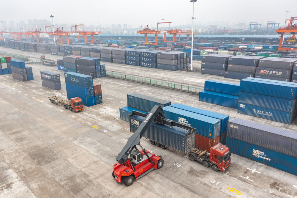 3月7日,在重慶團(tuán)結(jié)村中心站的海關(guān)監(jiān)管區(qū),工作人員將通過中歐班列發(fā)運(yùn)的貨物清關(guān)后裝上貨車運(yùn)往編組站進(jìn)行編組(無人機(jī)照片)。新華社記者 黃偉 攝