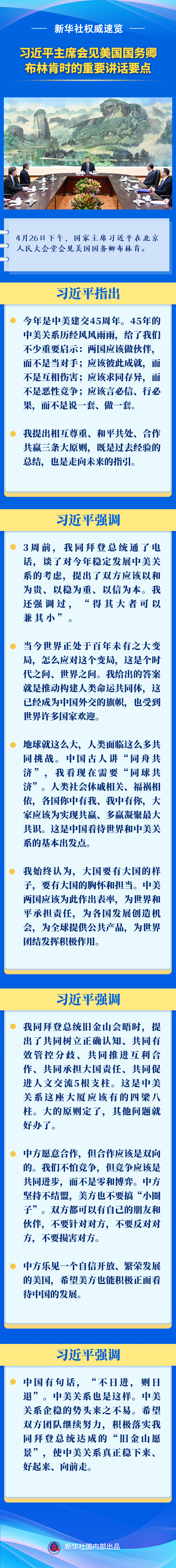 4月26日下午,國(guó)家主席習(xí)近平在北京人民大會(huì)堂會(huì)見美國(guó)國(guó)務(wù)卿布林肯。來看習(xí)近平主席的重要講話要點(diǎn)。