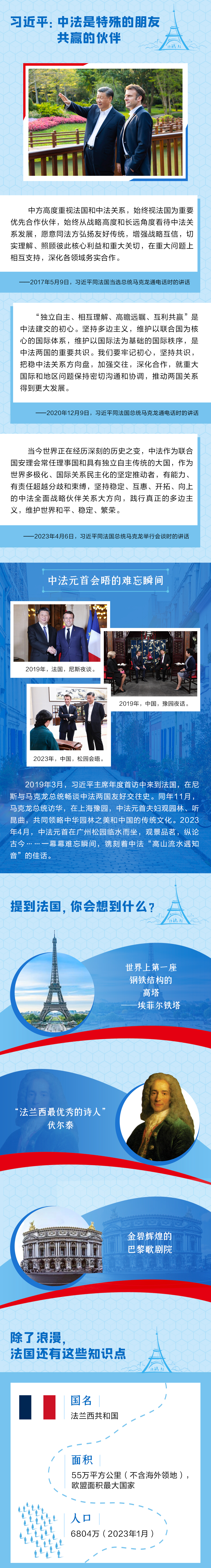 “法國是第一個同新中國正式建交的西方大國,也是最早同中國建立戰(zhàn)略伙伴關(guān)系和開展戰(zhàn)略對話、最早同中國開展民用核能合作的國家?!绷暯街飨瘡娬{(diào),中法是特殊的朋友,共贏的伙伴。