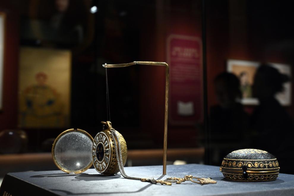 這是展出的故宮博物院藏銅鍍金殼開(kāi)光人物像懷表。2024年4月1日,作為中法文化旅游年的重要項(xiàng)目,“紫禁城與凡爾賽宮——17、18世紀(jì)的中法交往”展覽開(kāi)幕式在北京故宮文華殿舉行,展出大約200件文物精品。(新華社記者金良快攝)