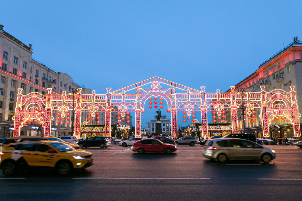 2024年2月9日,在俄羅斯首都莫斯科,車輛在中國(guó)新年主題裝飾前駛過。當(dāng)日,“莫斯科的中國(guó)新年”文化活動(dòng)在俄羅斯首都莫斯科市中心啟動(dòng)。 新華社記者 白雪騏 攝