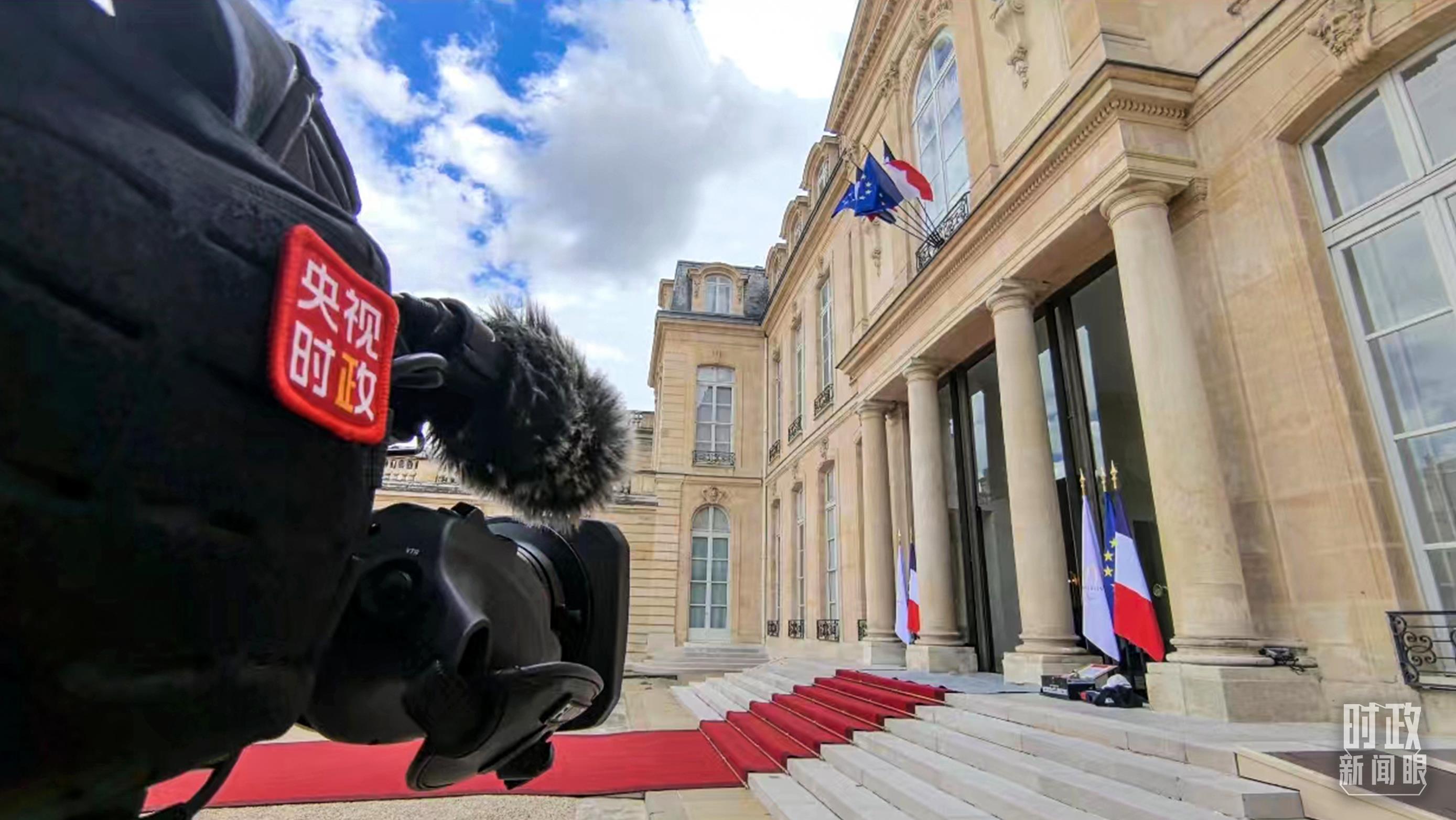 中法歐領(lǐng)導(dǎo)人三方會(huì)晤地點(diǎn)——愛(ài)麗舍宮懸掛中法兩國(guó)國(guó)旗。(總臺(tái)央視記者劉琦拍攝)
