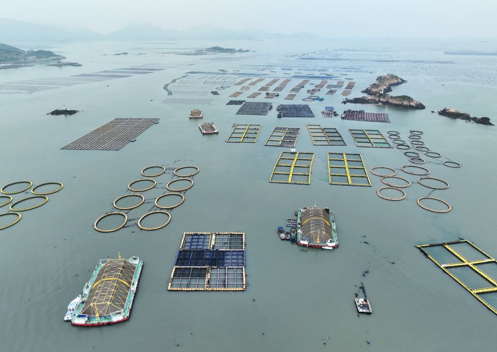 在福建連江定海灣海域,坐落著“定海灣1號(hào)”“定海灣2號(hào)”等深遠(yuǎn)海養(yǎng)殖平臺(tái)(2024年5月7日攝,無(wú)人機(jī)照片)。新華社記者 林善傳 攝