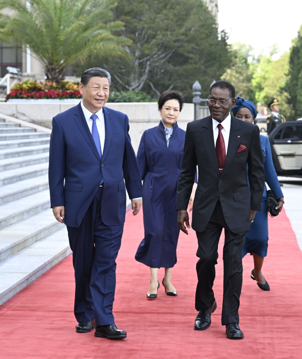 奧比昂抵達時,禮兵列隊致敬。兩國元首登上檢閱臺,軍樂團奏中赤幾兩國國歌,天安門廣場鳴放21響禮炮。奧比昂在習近平陪同下檢閱中國人民解放軍儀仗隊,并觀看分列式。