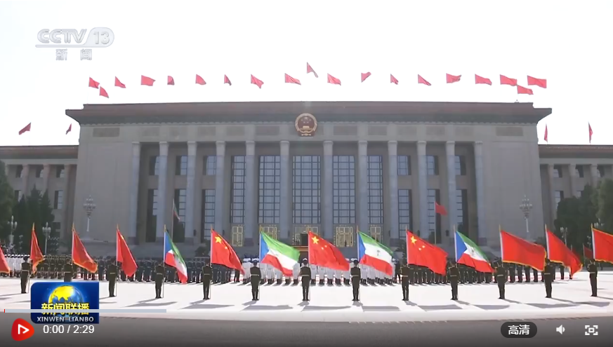 奧比昂抵達(dá)時(shí),禮兵列隊(duì)致敬。兩國元首登上檢閱臺,軍樂團(tuán)奏中赤幾兩國國歌,天安門廣場鳴放21響禮炮。奧比昂在習(xí)近平陪同下檢閱中國人民解放軍儀仗隊(duì),并觀看分列式。