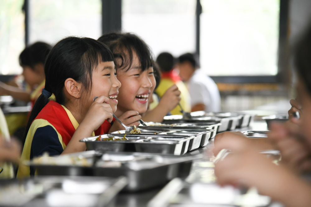 5月31日,學(xué)生在午餐時聊天。