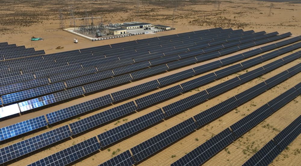 2024年5月16日在內(nèi)蒙古巴彥淖爾市磴口縣拍攝的烏蘭布和沙漠光伏基地(無人機照片)。烏蘭布和沙漠建設生態(tài)光伏基地,采取板上發(fā)電、板下種植的辦法,努力把沙海變?yōu)椤熬G?!?。
