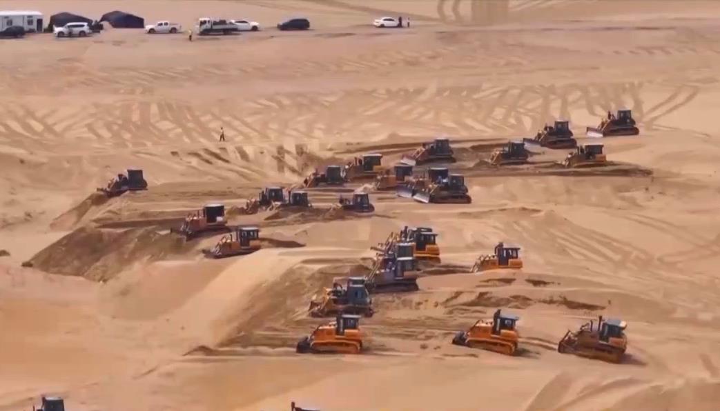 在內(nèi)蒙古鄂爾多斯的茫茫沙海中,近200臺推土機(jī)來回穿行,推平高低起伏、連綿不斷的沙丘,以便后續(xù)在此安裝光伏板。這正是當(dāng)下最新的光伏治沙模式中的一個環(huán)節(jié)。