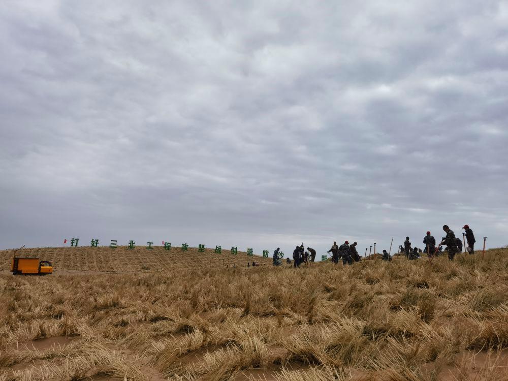 甘肅民勤縣的西大河小井子區(qū)域,草網(wǎng)格狀雙眉式沙障、稻草集束直立式沙障、尼龍網(wǎng)沙障等,間隔多行交錯排列。研究員們逐一測量沙障寬度、高度后,按當(dāng)?shù)厮Y源等條件,栽下梭梭、毛條、沙拐棗等樹種……