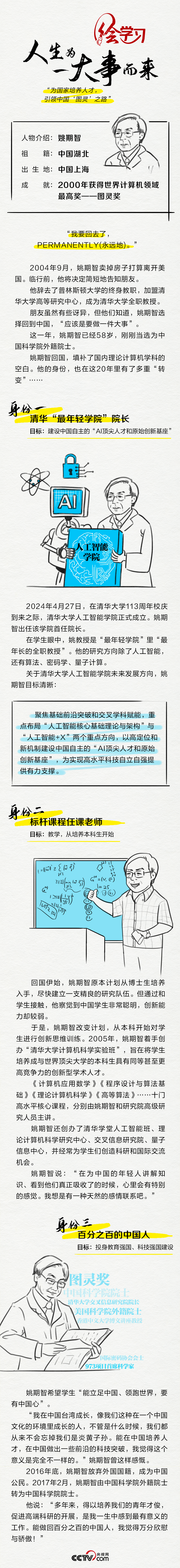 作為一名計(jì)算機(jī)科學(xué)專家,姚期智是圖靈獎(jiǎng)創(chuàng)立以來首位亞裔獲獎(jiǎng)?wù)?,也是世界現(xiàn)代密碼學(xué)基礎(chǔ)的奠基人之一。2004年,姚期智辭去美國普林斯頓大學(xué)終身教職,回國到清華大學(xué)全職任教。他曾說,“人生為一大事而來”。這件大事,就是“為國家培養(yǎng)人才,引領(lǐng)中國‘圖靈’之路”。央視網(wǎng)《天天學(xué)習(xí)》欄目推出手繪長(zhǎng)圖,為您講述姚期智將愛國之情化為報(bào)國之行的奮斗故事。