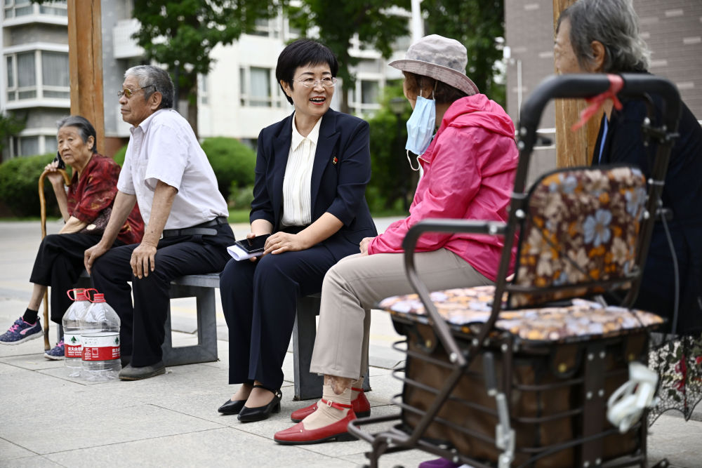 6月20日,寧夏銀川市金鳳區(qū)長(zhǎng)城花園社區(qū)黨委書記趙耐香(左三)在社區(qū)廣場(chǎng)與居民交流。