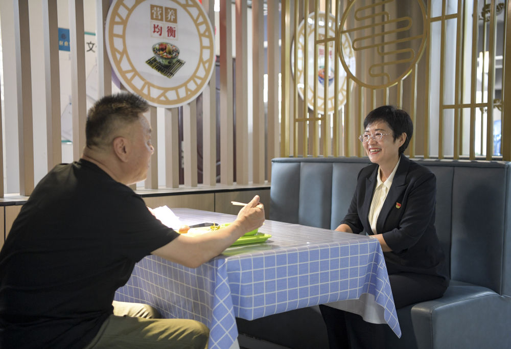 6月20日,寧夏銀川市金鳳區(qū)長(zhǎng)城花園社區(qū)黨委書記趙耐香在社區(qū)日間照料中心了解食堂運(yùn)行情況。