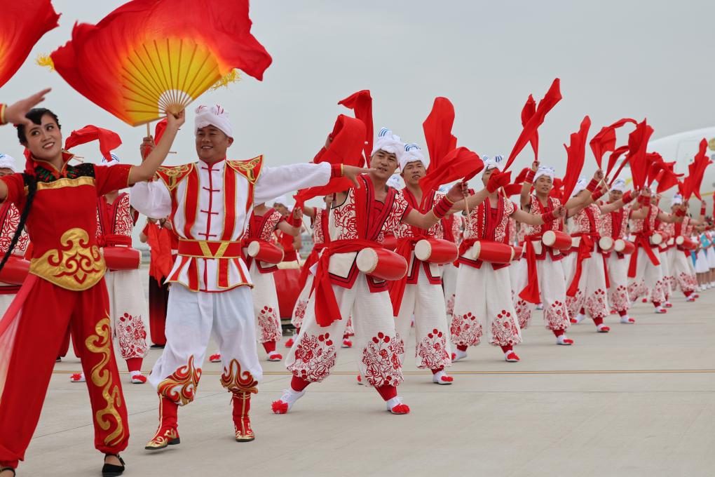 2023年5月17日下午,出席中國(guó)-中亞峰會(huì)的哈薩克斯坦總統(tǒng)托卡耶夫抵達(dá)陜西省西安市。當(dāng)?shù)孛癖娨詿崆榈难?、歡快的秧歌等民間藝術(shù)表演歡迎貴賓到來。新華社記者 邢廣利 攝
