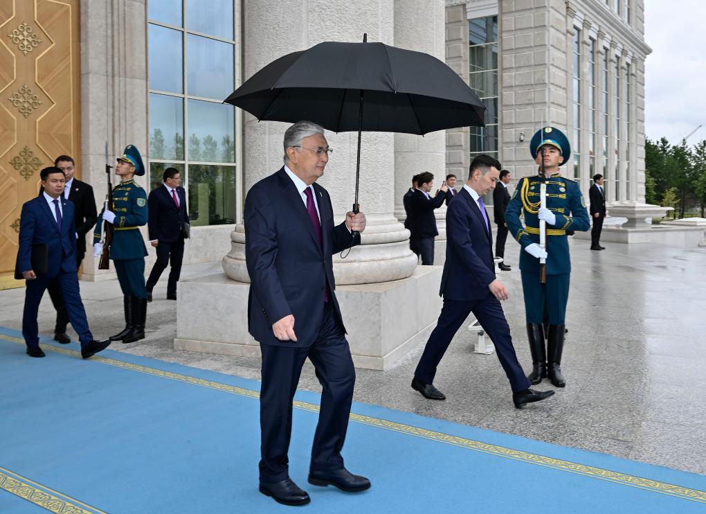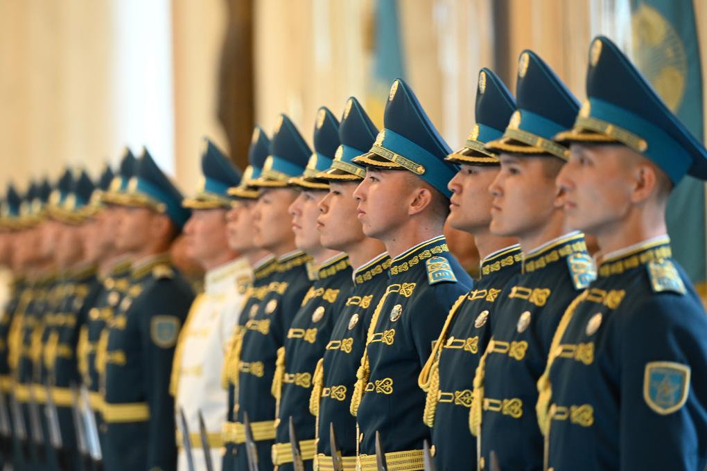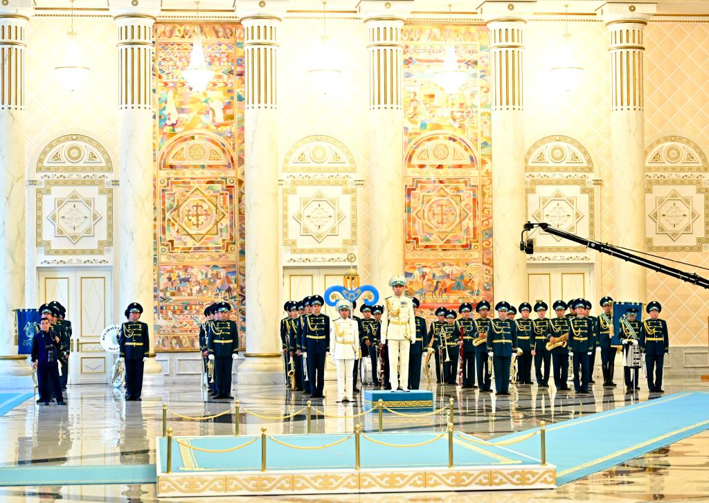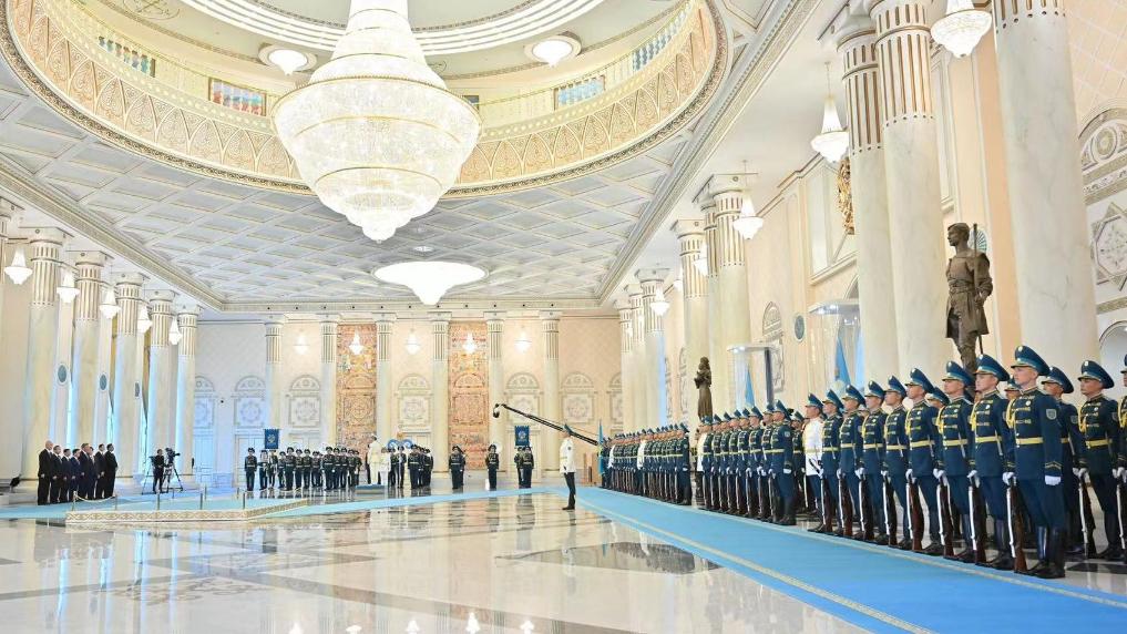 托卡耶夫為習(xí)近平舉行隆重歡迎儀式。總統(tǒng)府大廳氣勢恢宏,禮兵威武挺拔。兩國元首分別同對方陪同人員一一握手致意。兩國元首登上檢閱臺,軍樂團奏中哈兩國國歌。習(xí)近平在托卡耶夫陪同下檢閱儀仗隊。