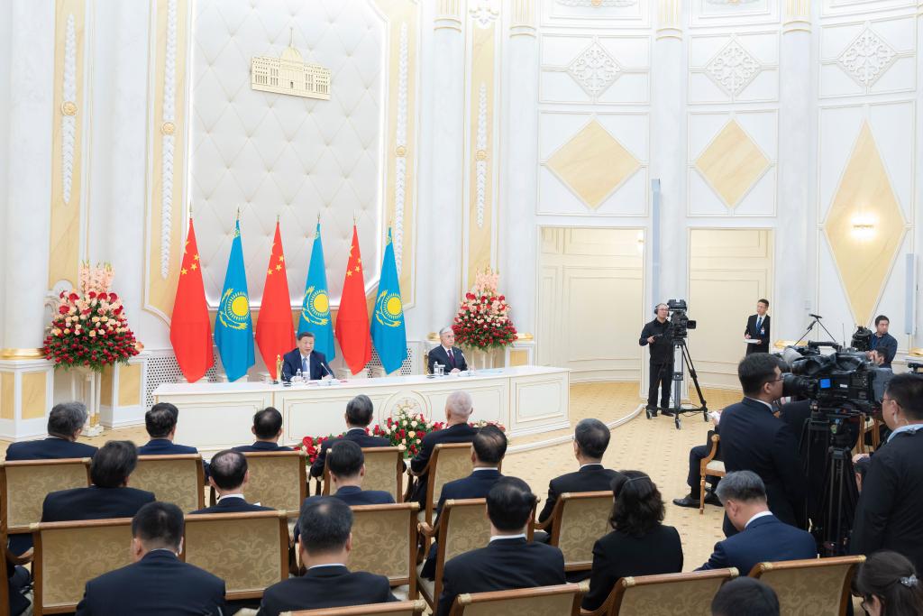 兩國元首共同簽署《中華人民共和國和哈薩克斯坦共和國聯(lián)合聲明》,并共同見證交換經(jīng)貿(mào)、互聯(lián)互通、航空航天、教育、媒體等領(lǐng)域數(shù)十項雙邊合作文件。