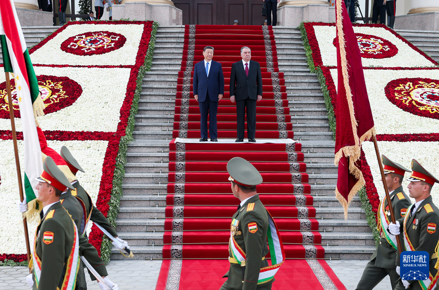 當?shù)貢r間7月5日下午,國家主席習近平同塔吉克斯坦總統(tǒng)拉赫蒙在杜尚別總統(tǒng)府舉行會談。拉赫蒙為習近平舉行盛大隆重的歡迎儀式。