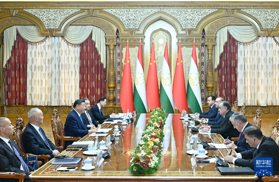 當?shù)貢r間7月5日下午,國家主席習近平同塔吉克斯坦總統(tǒng)拉赫蒙在杜尚別總統(tǒng)府舉行會談。這是兩國元首舉行大范圍會談。
