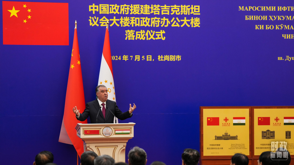 5日,拉赫蒙總統(tǒng)陪同習(xí)主席共同步入議會(huì)大樓。兩國元首參觀中方援塔議會(huì)大樓和政府大樓項(xiàng)目展板,共同為兩座大樓揭牌。