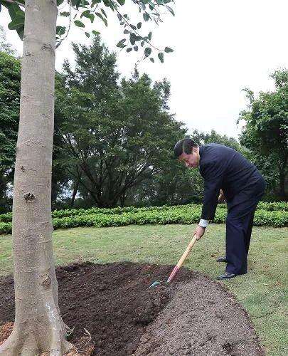 8年前種下的那棵高山榕已是亭亭如蓋、枝繁葉茂,展現(xiàn)出蓬勃的生命活力??倳涀叩綐湎?,深有感慨地說:“8年了,彈指一揮間啊。選的這個(gè)地方很好,樹冠能展開,樹長得也快?!?/p>
