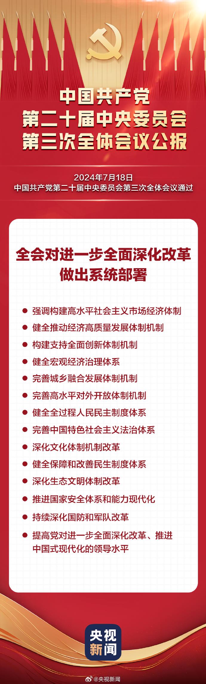 中國共產(chǎn)黨第二十屆中央委員會第三次全體會議于2024年7月15日至18日在北京舉行,全會對進一步全面深化改革做出系統(tǒng)部署,強調(diào)構(gòu)建高水平社會主義市場經(jīng)濟體制,健全推動經(jīng)濟高質(zhì)量發(fā)展體制機制,構(gòu)建支持全面創(chuàng)新體制機制,健全宏觀經(jīng)濟治理體系,完善城鄉(xiāng)融合發(fā)展體制機制,完善高水平對外開放體制機制,健全全過程人民民主制度體系,完善中國特色社會主義法治體系,深化文化體制機制改革,健全保障和改善民生制度體系,深化生態(tài)文明體制改革,推進國家安全體系和能力現(xiàn)代化,持續(xù)深化國防和軍隊改革,提高黨對進一步全面深化改革、推進中國式現(xiàn)代化的領(lǐng)導水平。