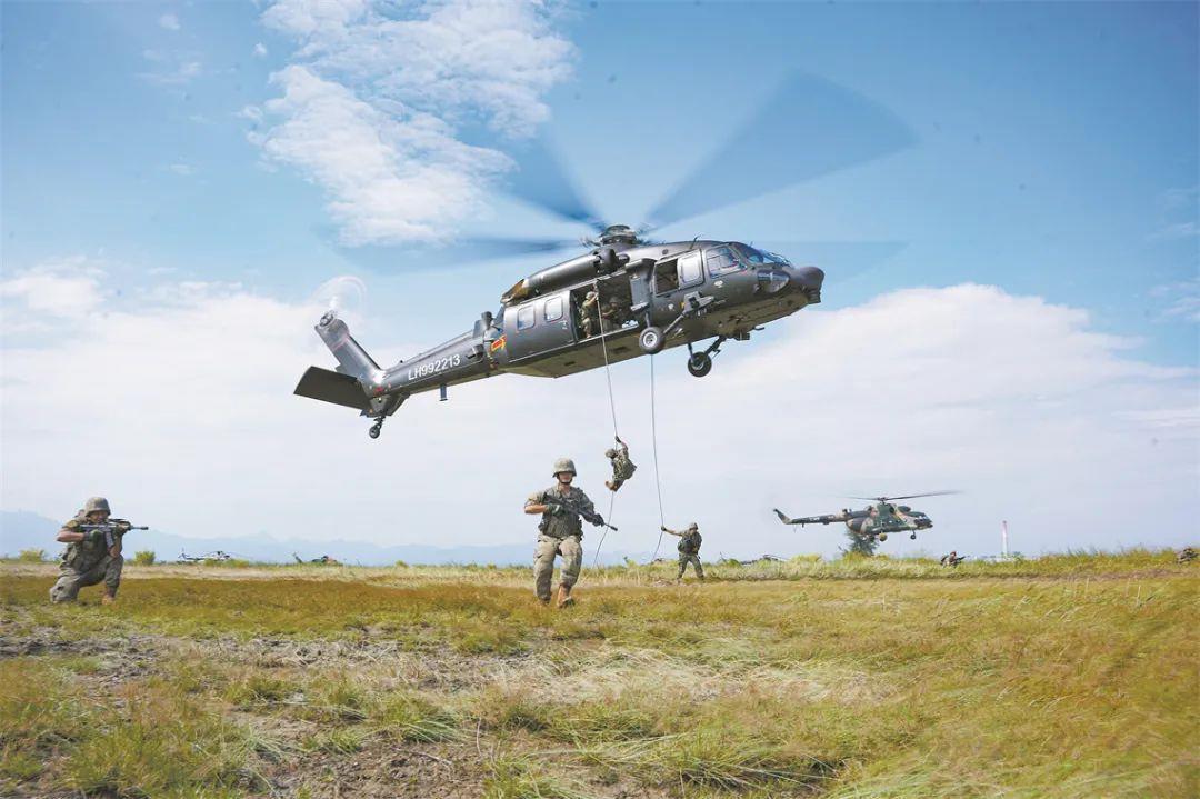 第72集團(tuán)軍某旅某合成營官兵在陸航部隊配合下開展機(jī)降訓(xùn)練。