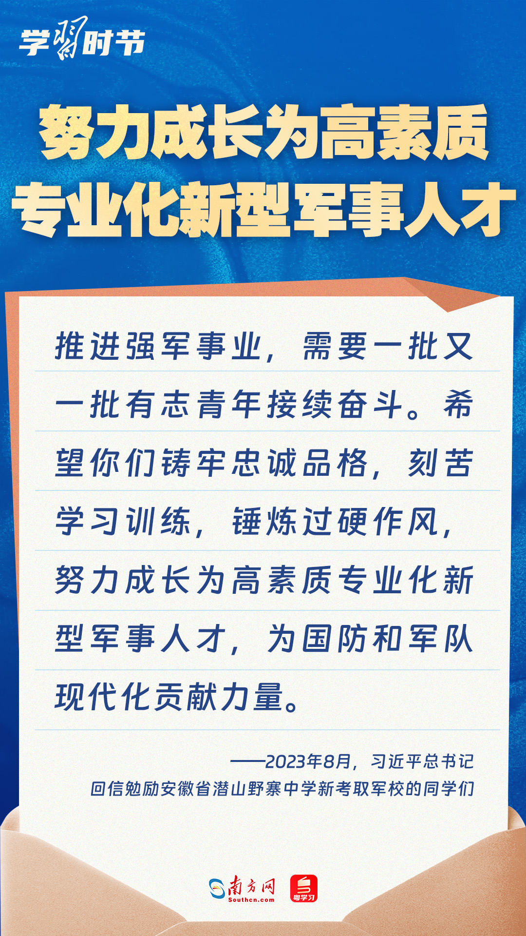 強國必須強軍,軍強才能國安。黨的十八大以來,習近平總書記始終牽掛一線官兵冷暖,高度重視我軍院校教育和人才培養(yǎng)工作,多次給部隊官兵、軍校學員等回信。讓我們一起重溫總書記的諄諄寄語!