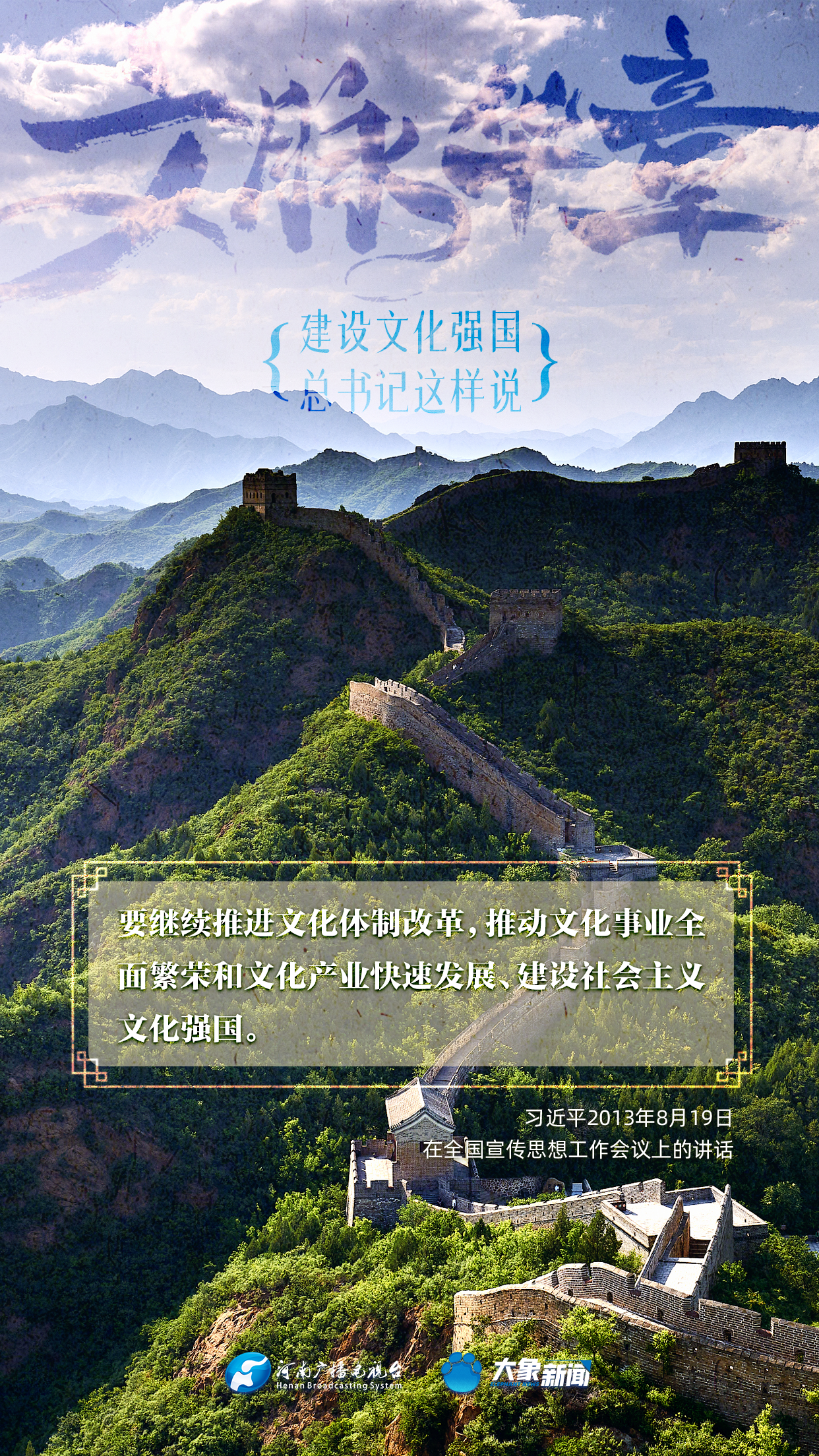 黨的十八大以來,習近平總書記站在全局和戰(zhàn)略高度,就建設社會主義文化強國提出一系列新思想新觀點新論斷,為我們堅定文化自信,堅持中國特色社會主義文化發(fā)展道路,提供了指引。大象新聞與您一起學習、領悟。