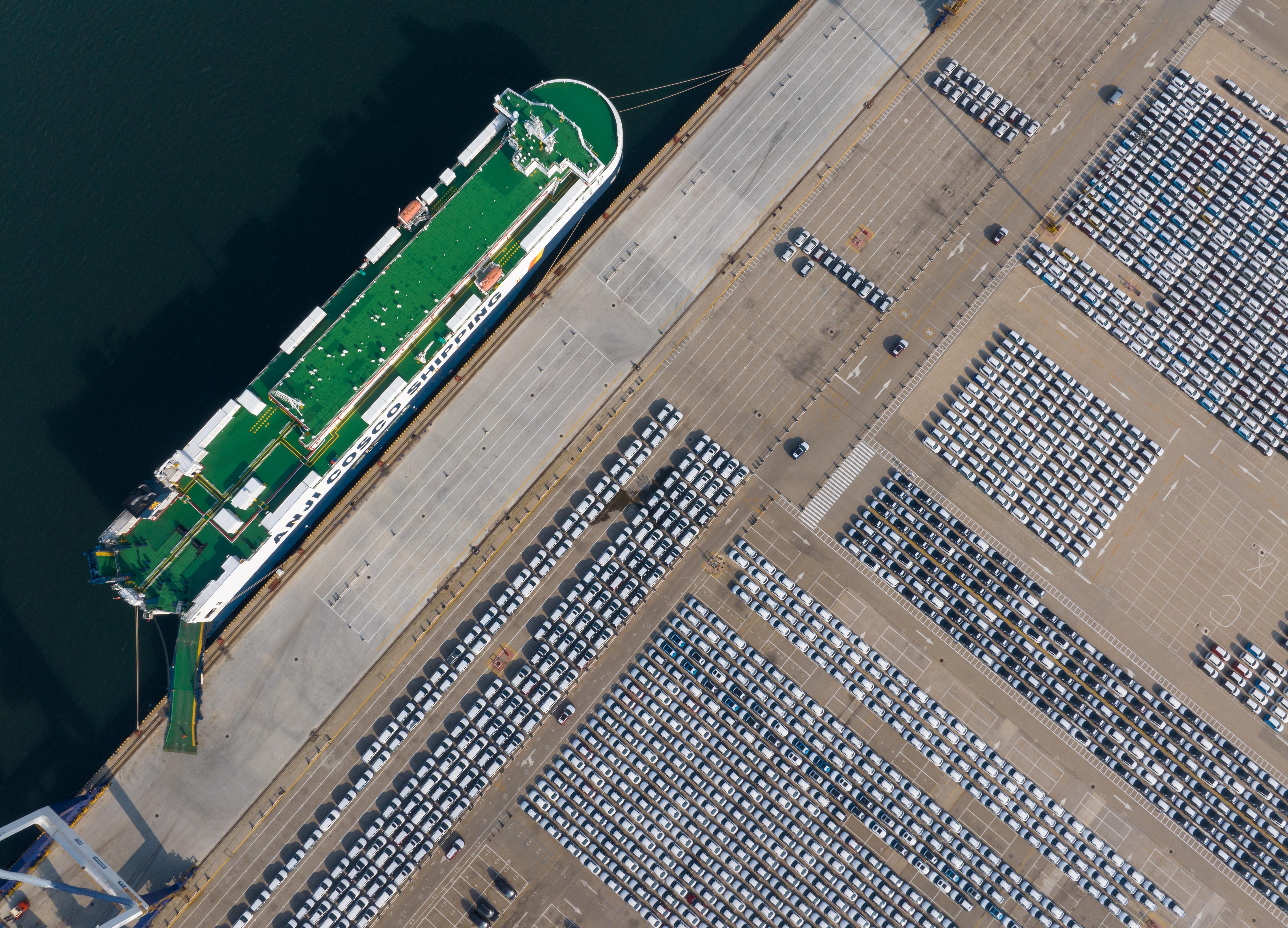 2024年7月11日,山東煙臺(tái),出口的新能源汽車在煙臺(tái)港專用碼頭整裝待發(fā)。