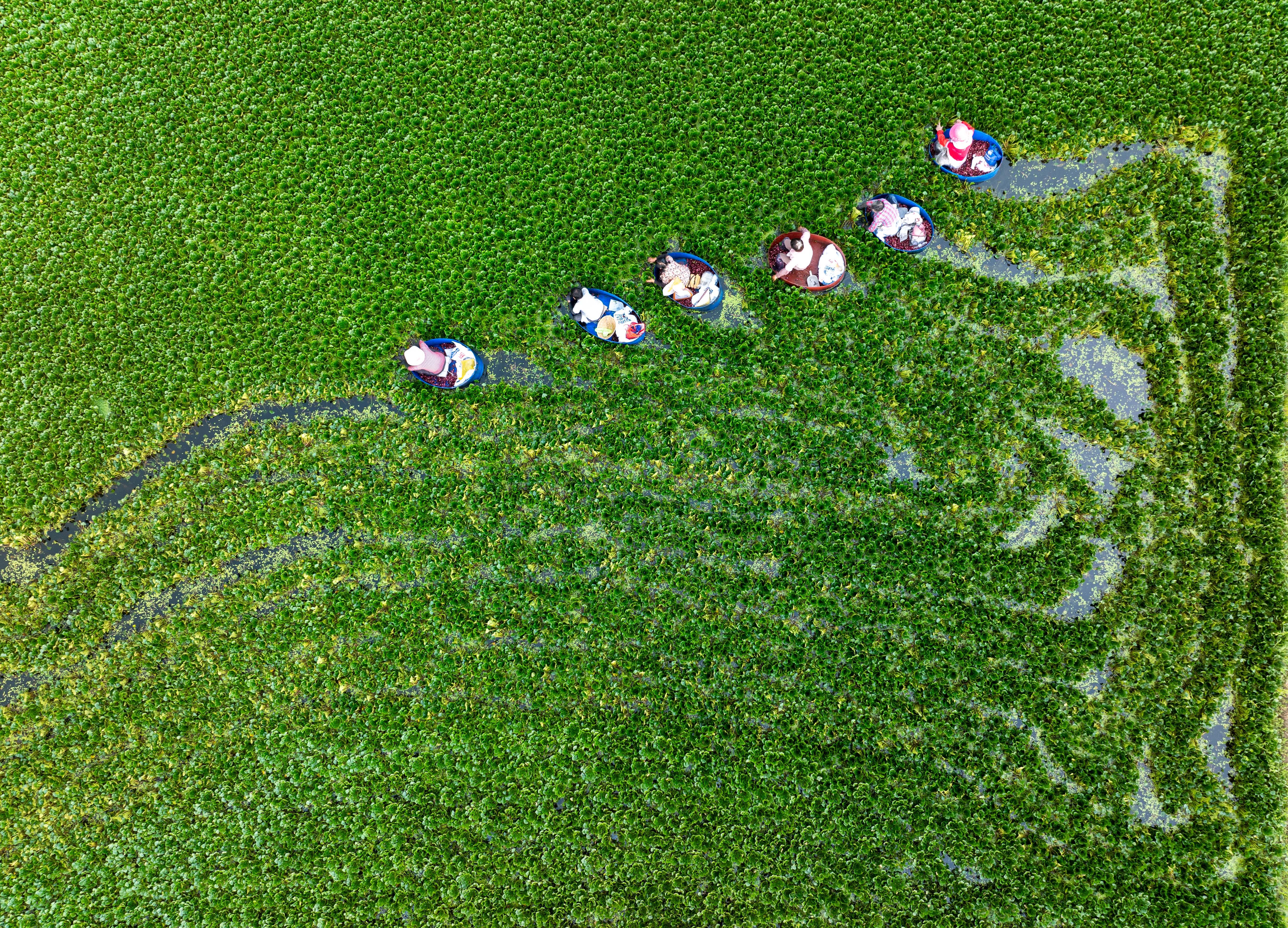 2024年8月7日,江蘇淮安市洪澤區(qū)岔河鎮(zhèn)的村民采收菱角。近年來,當(dāng)?shù)乩冒遵R湖優(yōu)質(zhì)水域生態(tài)為依托,帶動(dòng)當(dāng)?shù)剞r(nóng)民增收致富,助力鄉(xiāng)村振興。