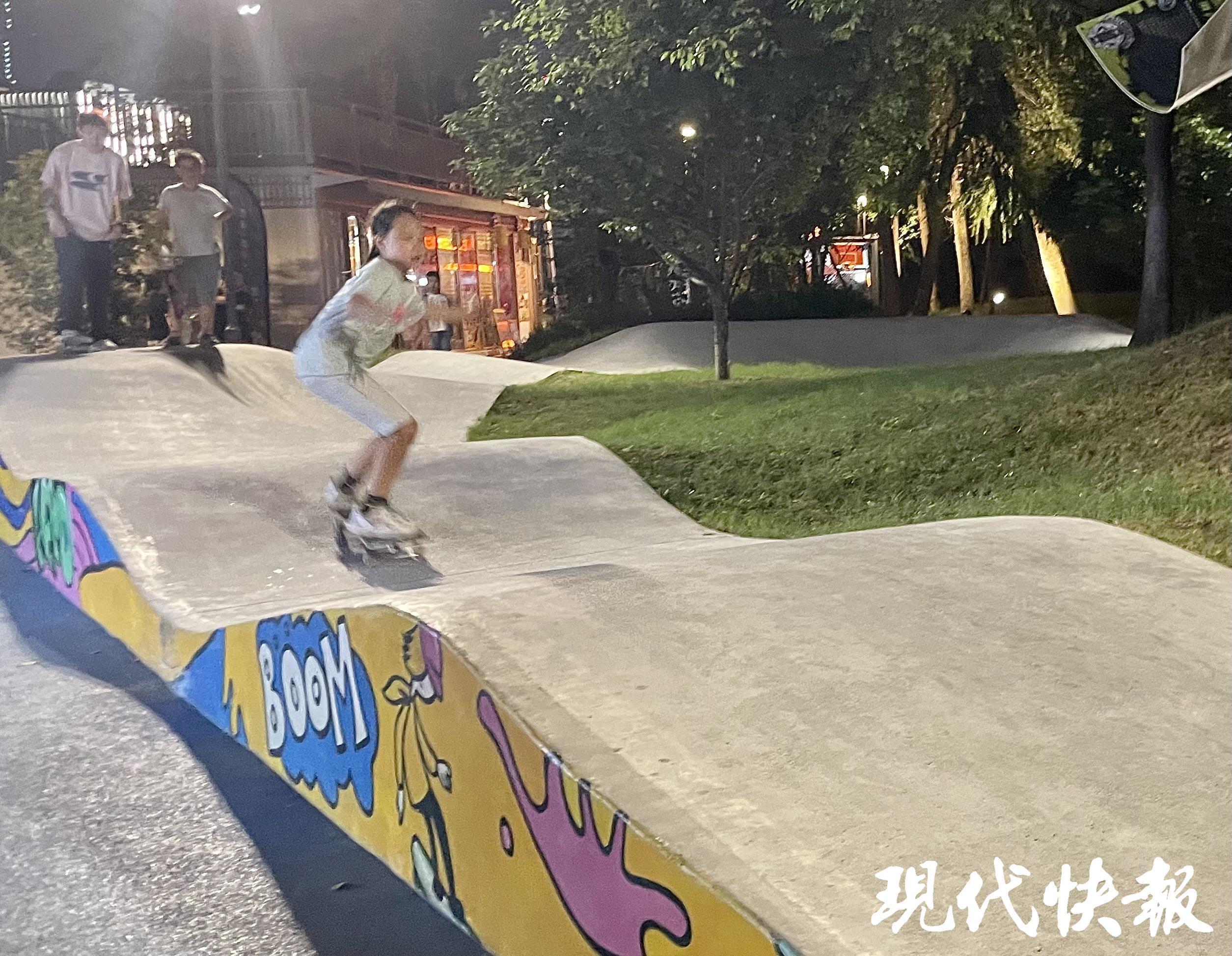 夜幕降臨,南京西城·夜未央的滑板場(chǎng)地上,一群青少年正在隨著起伏不定的坡道感受風(fēng)的速度。