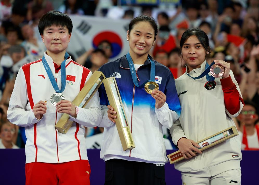 8月5日,羽毛球女單冠軍韓國選手安洗瑩(中)、亞軍中國選手何冰嬌(左)、季軍印度尼西亞選手瑪麗斯卡在頒獎(jiǎng)儀式上。