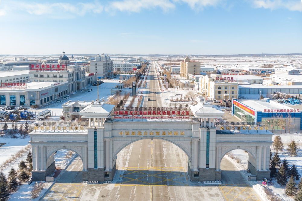 這是2024年1月31日拍攝的中國(黑龍江)自由貿(mào)易試驗(yàn)區(qū)黑河片區(qū)(無人機(jī)照片)。五年來,中國(黑龍江)自由貿(mào)易試驗(yàn)區(qū)將“試驗(yàn)田”種成“高產(chǎn)田”,以全省萬分之三的面積,貢獻(xiàn)了全省約五分之一的實(shí)際使用外資和七分之一的外貿(mào)進(jìn)出口,在對(duì)外合作、降低物流成本、培育特色產(chǎn)業(yè)和新業(yè)態(tài)新模式等方面深入探索,成功產(chǎn)出超過300項(xiàng)制度創(chuàng)新成果。