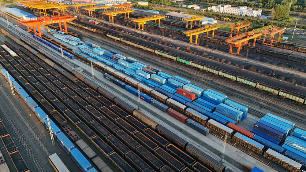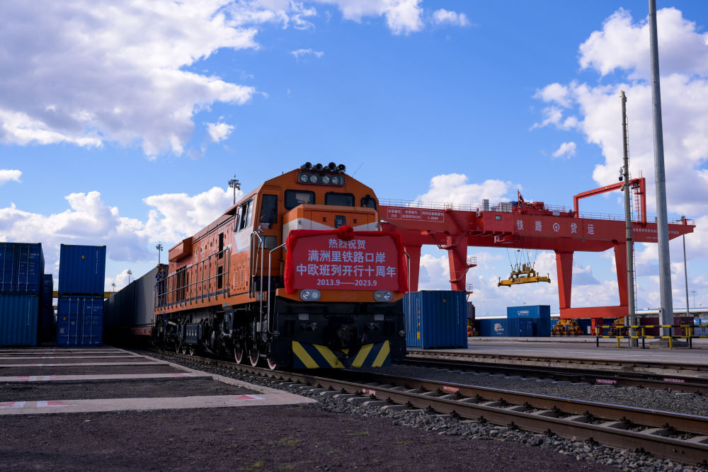 2023年9月20日,一列中歐班列行駛在內(nèi)蒙古滿洲里站貨運(yùn)車間集裝箱場(chǎng)。作為我國向北開放的“橋頭堡”、中歐班列“東通道”的重要口岸,滿洲里鐵路口岸不斷加大中歐班列通道能力建設(shè),進(jìn)一步提升運(yùn)輸效率和品質(zhì)。