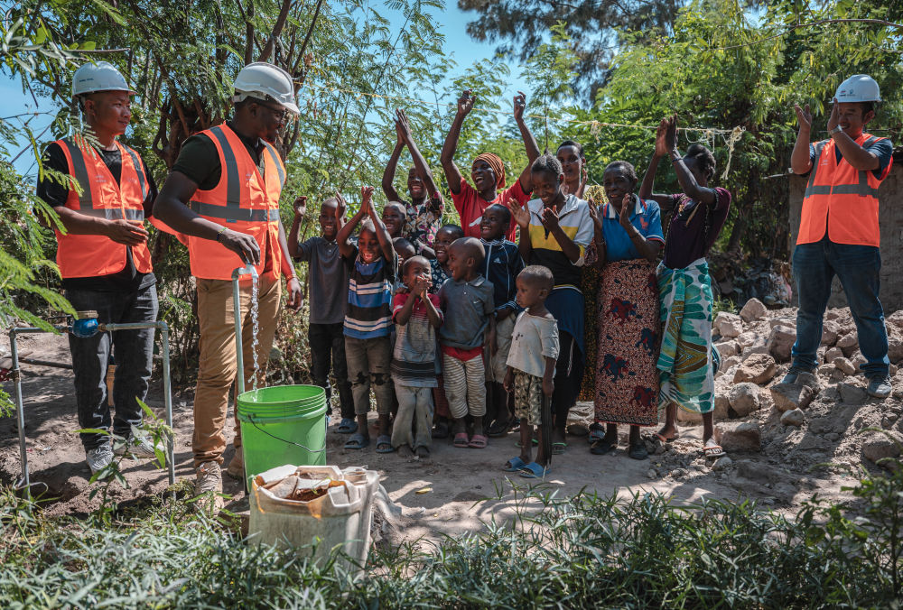 2023年6月13日,在坦桑尼亞姆萬扎省米松圭,工作人員接通水管后贏得當(dāng)?shù)鼐用窆恼茪g呼。新華社記者 王冠森 攝