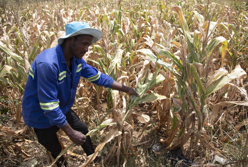 4月3日,農(nóng)民在津巴布韋首都哈拉雷近郊的一塊玉米地檢查作物長勢。新華社發(fā)