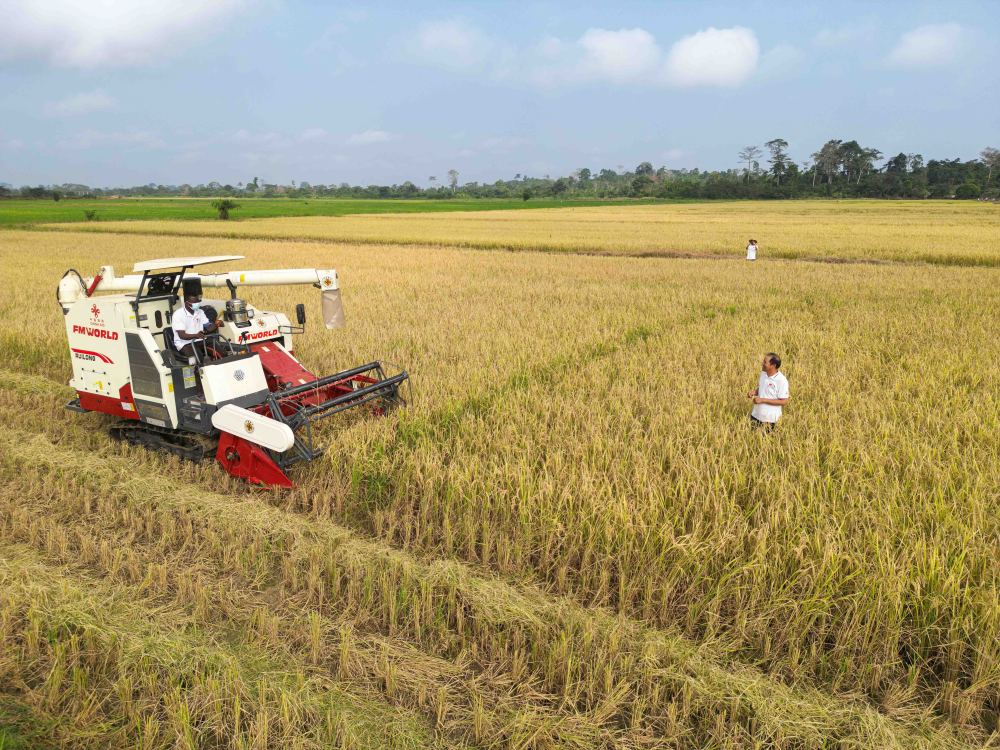 2024年1月8日,在科特迪瓦南部迪沃省格格杜墾區(qū),中國(guó)援科農(nóng)業(yè)技術(shù)合作組組長(zhǎng)郭長(zhǎng)友(右一)指導(dǎo)稻農(nóng)駕駛收割機(jī)收割水稻(無(wú)人機(jī)照片)。格格杜墾區(qū)是中科兩國(guó)農(nóng)業(yè)合作示范基地,也是科特迪瓦全國(guó)聞名的水稻種植基地。