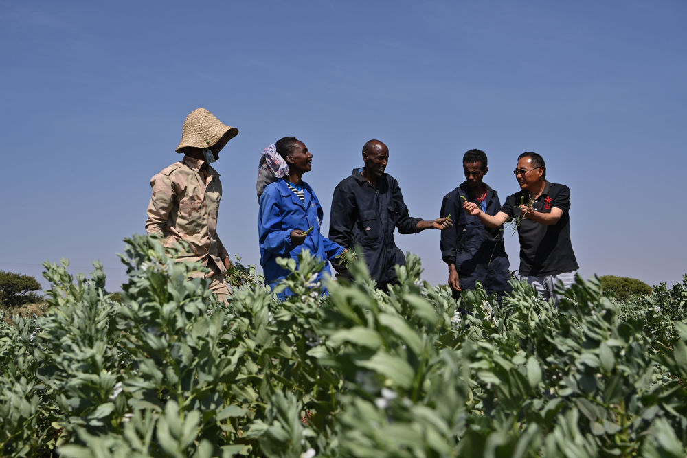 2023年9月27日,在位于厄立特里亞阿斯馬拉的農(nóng)業(yè)技術(shù)援助項(xiàng)目示范地,中國(guó)援厄第三期高級(jí)農(nóng)業(yè)專(zhuān)家組豆類(lèi)作物專(zhuān)家劉運(yùn)民(右一)與當(dāng)?shù)剞r(nóng)戶交流。為推動(dòng)厄立特里亞農(nóng)業(yè)產(chǎn)業(yè)發(fā)展,中國(guó)農(nóng)業(yè)農(nóng)村部已派出多批專(zhuān)家在厄立特里亞開(kāi)展涉及豆類(lèi)作物、果樹(shù)園藝、油料等領(lǐng)域的技術(shù)援助工作。