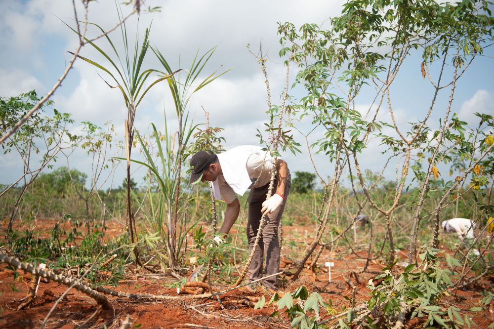 2020年3月24日,在位于海南省的中國(guó)熱帶農(nóng)業(yè)科學(xué)院的一處基地,來(lái)自埃及的副教授哈馬達(dá)·穆罕默德·哈?!ぐ⒉范爬瓍⒓又袊?guó)熱科院熱帶生物技術(shù)研究所木薯育種團(tuán)隊(duì)開(kāi)展的木薯選育新技術(shù)培訓(xùn)。