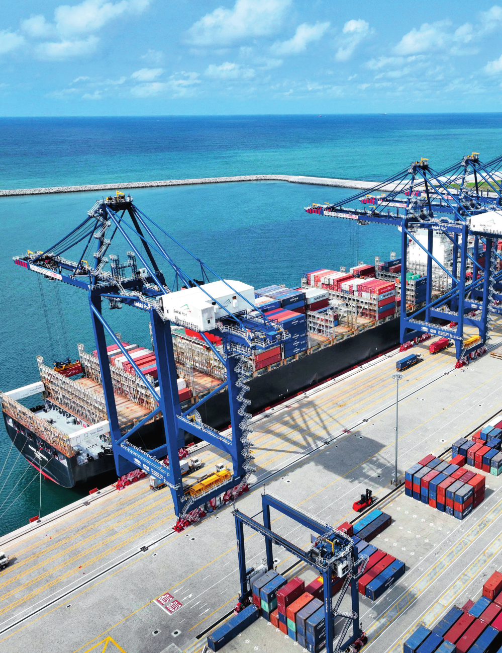 由中國港灣工程有限責任公司承建的尼日利亞萊基深水港位于中尼合作建設的拉各斯萊基自貿(mào)區(qū)內(nèi),是尼日利亞首個現(xiàn)代化深水港和最大港口。圖為一艘貨輪在尼日利亞拉各斯萊基深水港裝卸集裝箱(2024 年 3 月 11 日攝)萊基港公司供圖