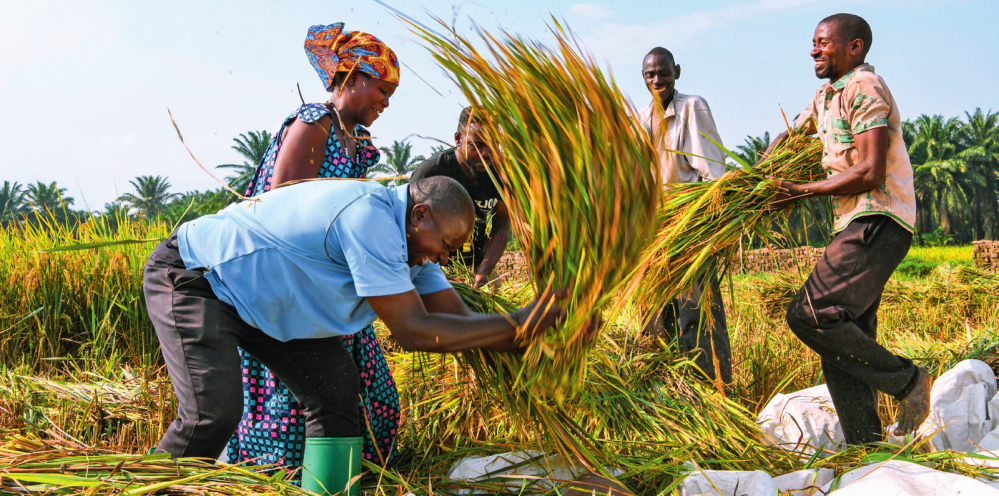 2018 年,中國農(nóng)業(yè)專家組在布隆迪布班扎省吉漢加縣設立首個水稻減貧示范村。圖為當?shù)剞r(nóng)戶在稻田里給雜交水稻脫粒(2023年6月20日攝) 韓旭攝 / 本刊