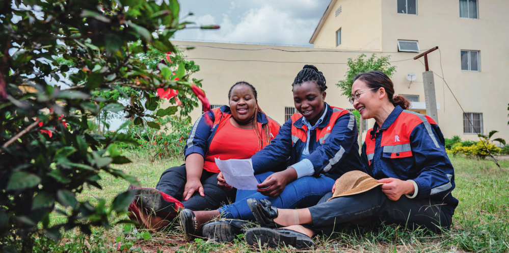 在肯尼亞內(nèi)羅畢,非洲之星鐵路運營公司工電部電子設備檢修工區(qū)工長陳玲(右)在休息時教學員唱中文歌曲(2023年5月23日攝) 王冠森攝 / 本刊