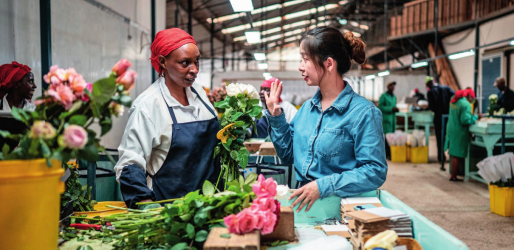 湖南璽悅國際貿(mào)易有限公司負責人黃梓楠(右)在肯尼亞納紐基的坦布濟花卉農(nóng)場挑選鮮花(2024年5月18日攝)王冠森攝 / 本刊