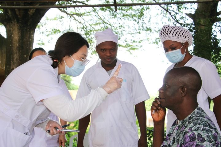 2024年6月6日,在貝寧阿波美中心醫(yī)院,中國(guó)第27批援貝寧醫(yī)療隊(duì)醫(yī)生為當(dāng)?shù)鼐用窈Y查眼科疾病。新華社發(fā)(塞拉芬攝)