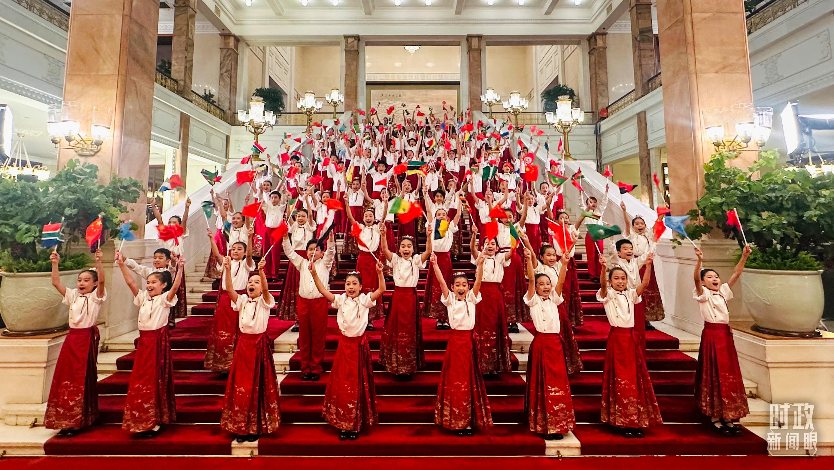 壁畫緩緩打開(kāi),百余名身著中國(guó)傳統(tǒng)服飾的少年兒童揮舞著旗幟,熱情演唱《把未來(lái)點(diǎn)亮》、《歌聲與微笑》、非洲歌曲《Waka Waka》等。